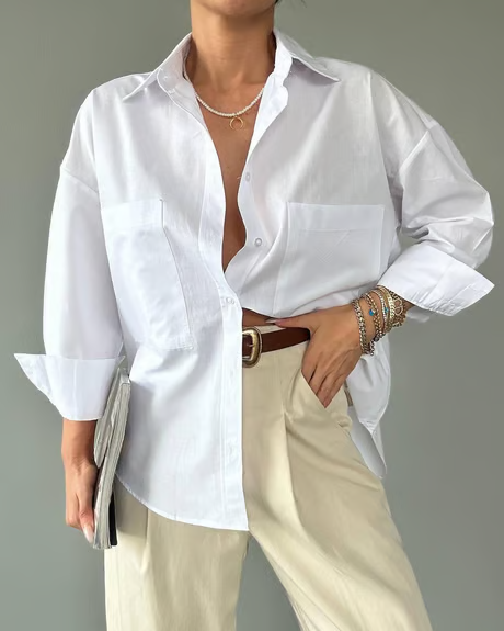 Спробуйте комбінацію: оверсайз біла сорочка + топ-корсет або бралет зверху. Це гра контрастів: маскулінність об’ємної сорочки проти підкресленої жіночності корсета. Це виглядає неймовірно стильно і візуально робить талію осиною. Слідкуйте за тим, щоб сорочка не збиралася некрасивими складками під топом — для цього обирайте сорочки з бавовни середньої щільності, які тримають форму.