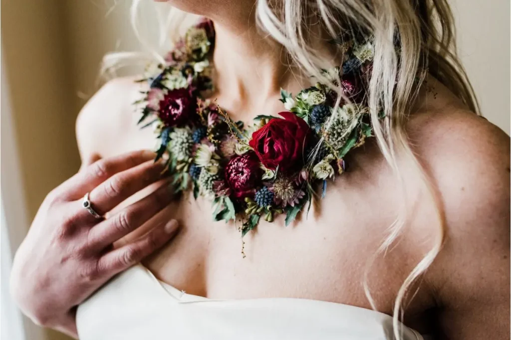 Если чокер кажется слишком смелым вариантом, обратите внимание на более классические колье и подвески. Это могут быть нежные цепочки с маленьким кулоном-цветком, массивные колье из нескольких цветочных элементов или стилизованные украшения из металла или смолы.