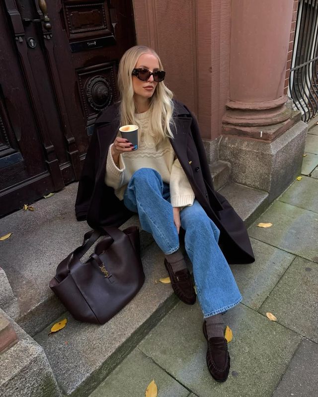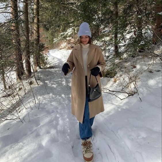 Це найвищий пілотаж зимового стилю. Поєднання різних відтінків білого та бежевого виглядає надзвичайно дорого. Одягніть молочні джинси-труби, кашеміровий гольф у кольорі “вівсянка” та довге пальто кольору camel. Довге пальто — це не лише про стиль, а й про практичність: воно захищає задню частину штанів від бризок під час прогулянки.