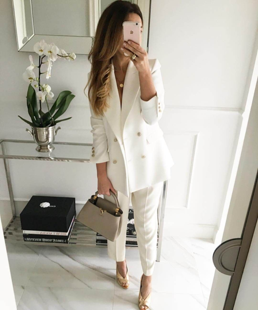 - Ідеально скроєний жакет. Це справжня альфа і омега ділового стилю. Обираючи його, зверніть увагу на лінію плеча — вона має бути чіткою, але не надто масивною. Тканина має тримати форму. Не обмежуйтеся чорним! Глибокий синій (navy) виглядає не менш формально, але більш цікаво. Бежевий, кемел, сірий або навіть винний відтінок стануть чудовою альтернативою. Він миттєво структурує будь-який образ, навіть якщо під ним проста біла футболка та джинси (якщо це дозволяє дрес-код).